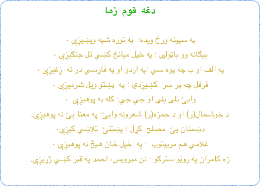 دبيلګي په ډول څلور سوه کاله دمخه د افغان و تلو ملي شا عرانو هر يوخوشخال خټک او رحمان بابا دپښتونولۍ ، اد ب، شعر، فرهنګ او خپلواکې دارزښتونوپه اړوند يو نوې پړاو پرانيستلوچې موږته لکه دخلاصې خزانې په څير ميراث را پاتې شوىدى. دنوموړو شاعرانوددرس له برکته يو بل افغا ن شاعر دطبيعي علومودارزښت په تړاوخپل ټبر ته په لاندې شعرکې دپوهې او سيالۍ خطا ب کوي