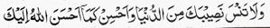 ژباړه : او مه هيروه برخه خپله ( څه شی چې دتا په نصيب شوې دې لکه مال اومورنۍ ژبه اونور ) په دې نړې کې او مرسته کوه (له بندګانو دالله سره) لکه چې احسان کړې دی الله له تاسره